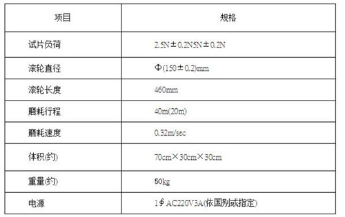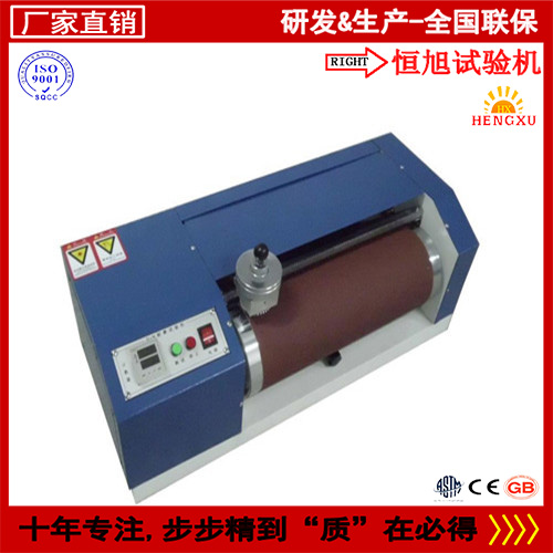 2、砂纸包贴在滚筒的表面,试样紧压在带有砂纸的滚筒上,使试样沿滚筒横向移动.磨耗是在圆柱型试样的一端产生,测量试样的质量损失值,并由试样的密度计算体积磨耗量.